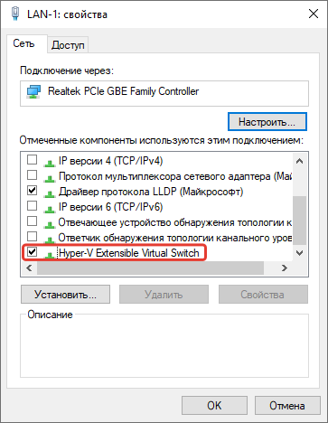 В свойствах можно увидеть, что адаптер работает на виртуальный коммутатор.