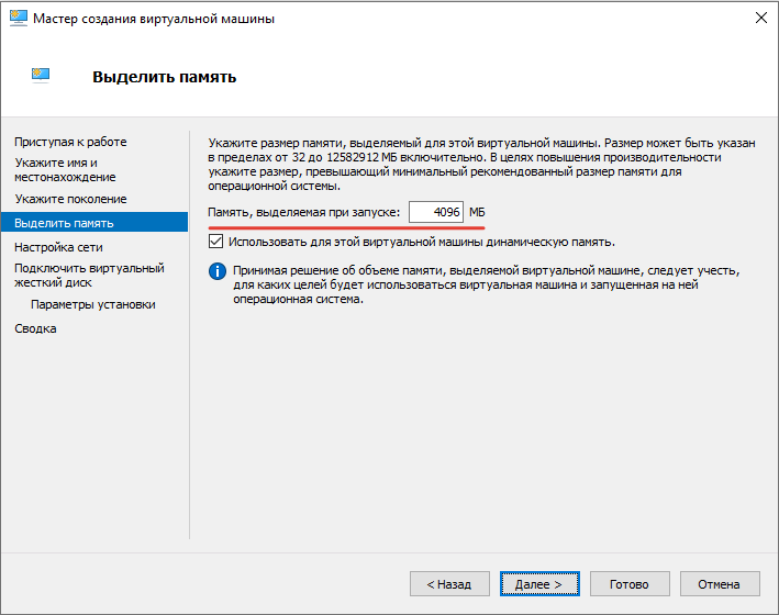 Указываем объем оперативной памяти. Оставляем галочку «Использовать для этой ВМ динамическую память»