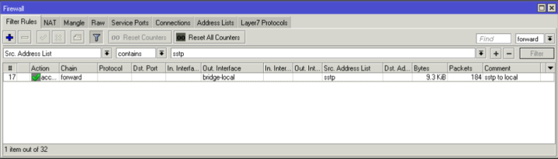 И создадим правило (Filter Rules). Из адрес листа (Src. Address List) sstp на локальный бридж, в цепочке forward разрешаем подключения: