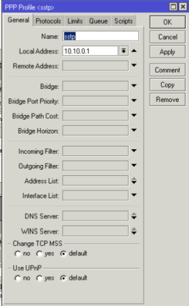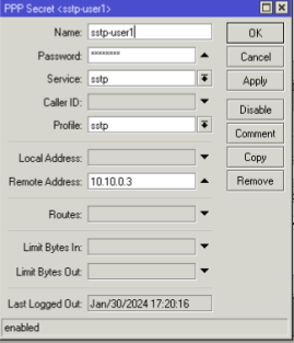 Адрес на sstp интерфейсе роутера будет 10.10.0.1, а клиенты будут получать адреса при подключении к sstp-серверу: 10.10.0.2, 10.10.0.3, 10.10.0.4 и так далее.