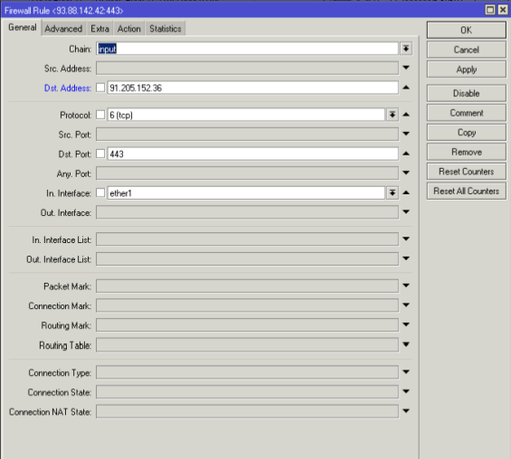 Здесь я разрешил входящий трафик (input) на внешний адрес этого роутера (Dst. Address). Дополнительно, проверяется протокол (Protocol) и порт подключения (Dst. Port) и входящий интерфейс (In. Interface).