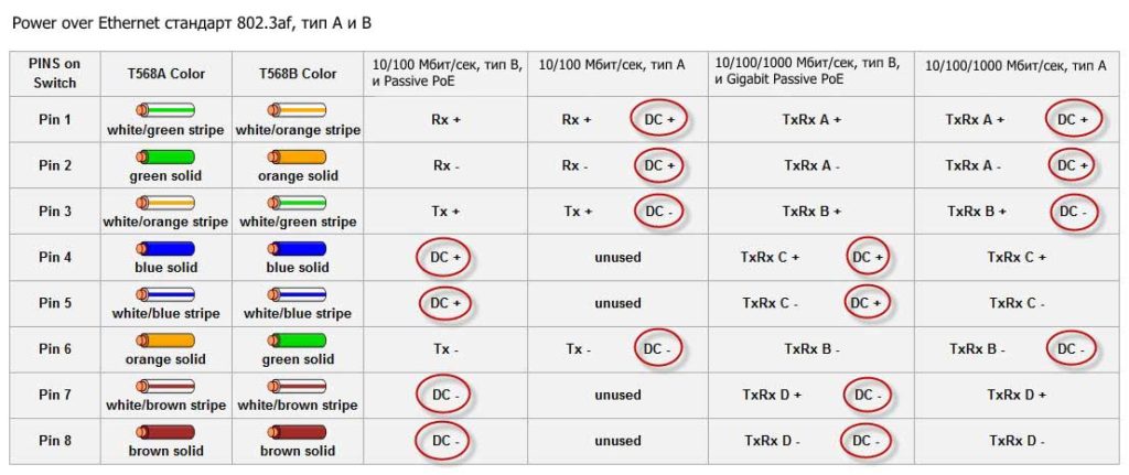Сама реализация питания по сетевому кабелю (витой паре) различается по типу распиновки. А еще в зависимости от напряжения на порт PoE делится на классы.