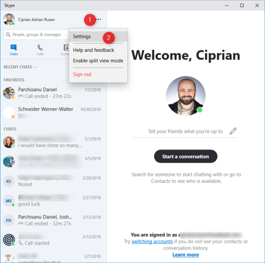 На вашем компьютере или устройстве с Windows 10 откройте Skype. Затем войдите в свою учетную запись и нажмите или коснитесь трех точек рядом с вашим именем. В открывшемся меню нажмите или коснитесь Настройки.