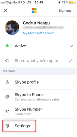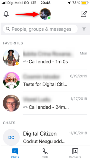 На вашем iPhone или iPad откройте приложение Skype и войдите в свою учетную запись. Затем нажмите на свое изображение в верхней части Skype.