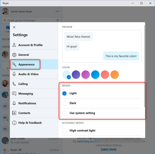 Вы также можете нажать или нажать на свое имя, а затем на Настройки, для того же результата. После загрузки настроек Skype, перейдите в Внешний вид. Там найдите раздел «Режимы», где вы можете включить темную или светлую тему. Вы также можете настроить Skype на «Использовать настройки системы», чтобы он использовал ту же тему, что и Windows 10.