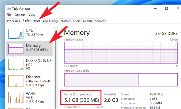 Затем в окне диспетчера задач щелкните вкладку «Производительность». Затем нажмите на опцию «Память» на левой боковой панели. После этого найдите параметр памяти «Используется»; вы сможете увидеть текущую «сжатую» память внутри круглых скобок, если она включена.