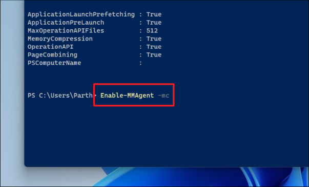 Если вы здесь, чтобы включить сжатие памяти в своей системе, введите указанную ниже команду и нажмите Enterна клавиатуре, чтобы выполнить команду.
