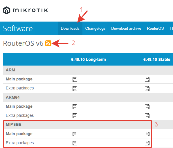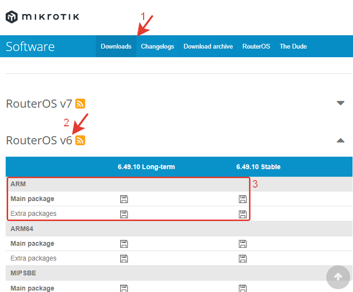 Переходим на сайт MikroTik. Скачиваем файлы обновления и дополнительные пакеты нужной архитектуры.