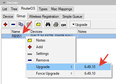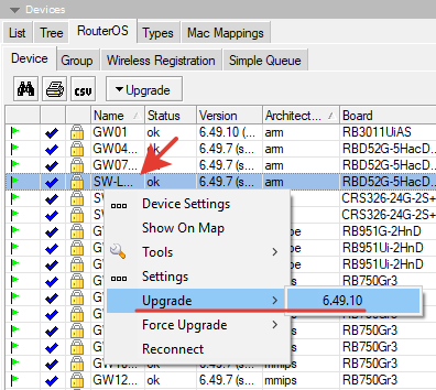 Выбираем устройство и нажимаем Upgrade >> 6.49.10.