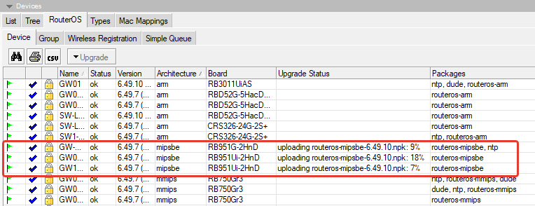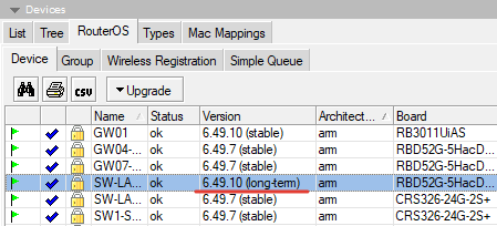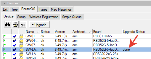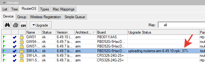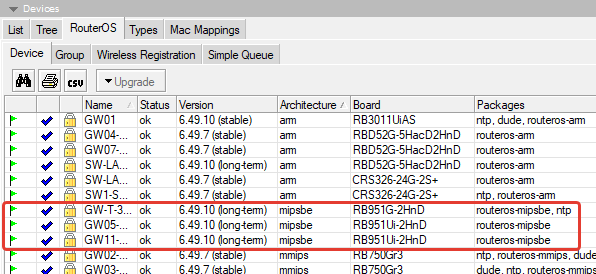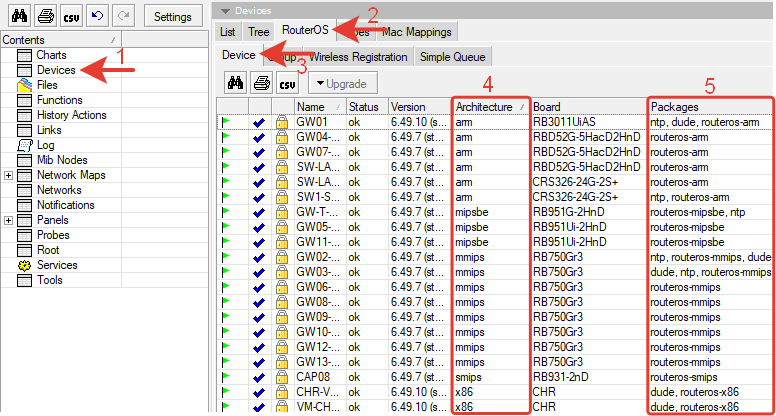 Проверяем статус устройств с RouterOS (синяя галочка – ок). Сортируем устройства по архитектуре. Так же смотрим, какие установлены дополнительные пакеты.