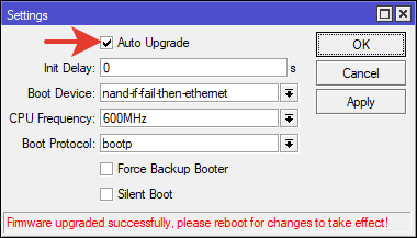 В наших роутерах установлена галочка Auto Upgrade в RouterBoard >> Settings.