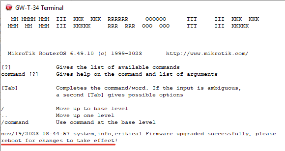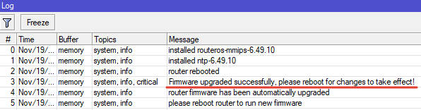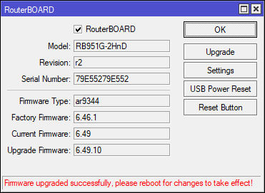 Роутер перезагрузится. После этого можно увидеть, что версия его RouterOS изменилась.