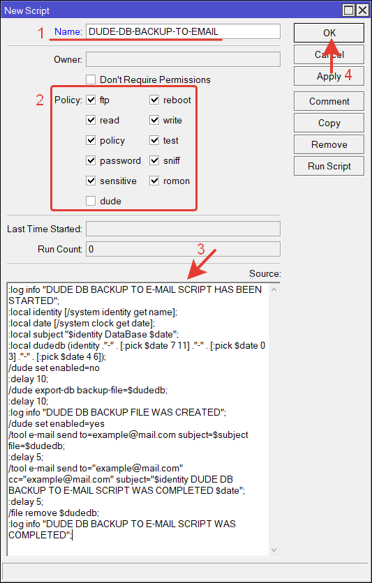 Name: DUDE-DB-BACKUP-TO-EMAIL – понятное имя без пробелов.