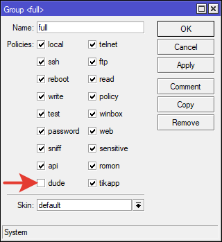 Policy: отмечаем все политики, отметка dude не срабатывает.