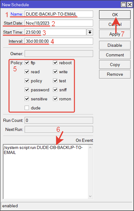 | /system scheduler add interval=4w2d name=DUDE—BACKUP—TO—EMAIL on—event=«/system script run DUDE-DB-BACKUP-TO-EMAIL» policy=ftp,reboot,read,write,policy,test,password,sniff,sensitive,romon start—date= nov/18/2023 start—time=23:50:00 |