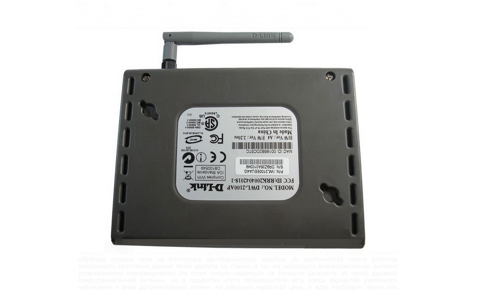 WAP 2100АР, как и бóльшая часть продукции D-Link Corporation, имеет пластмассовый корпус серебристого окраса с яркими голубыми вставками и типичным дизайном решётки для отвода тепла. Всё строго и лаконично.