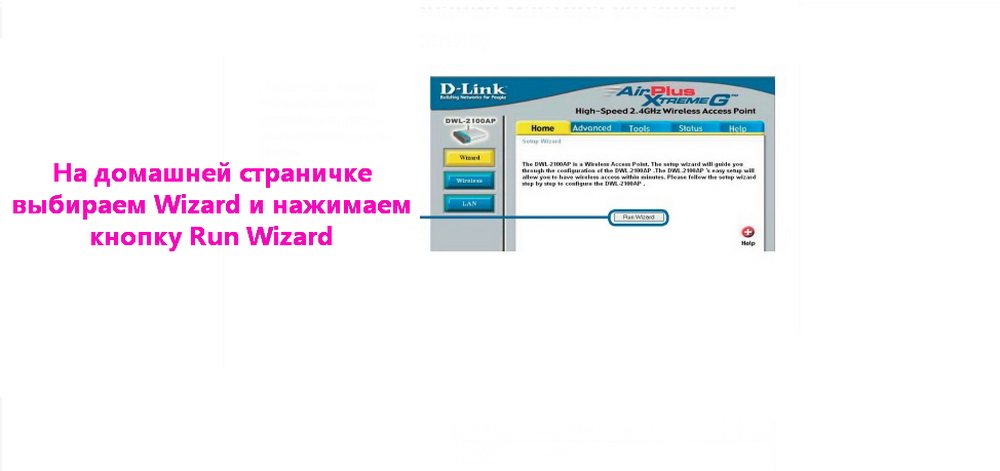 - Доступ к управлению настройками DWL-2100АР получен. Отобразится интерфейс устройства, где выбираем Home → Wizard→ и нажимаем Run Wizard.