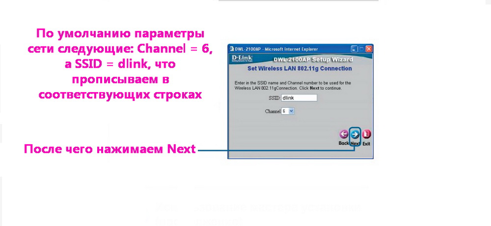 - Далее, делаем настройку беспроводного интерфейса. По умолчанию параметры сети следующие: Channel = 6, а SSID = dlink, что прописываем в соответствующих строках и нажимаем Next.