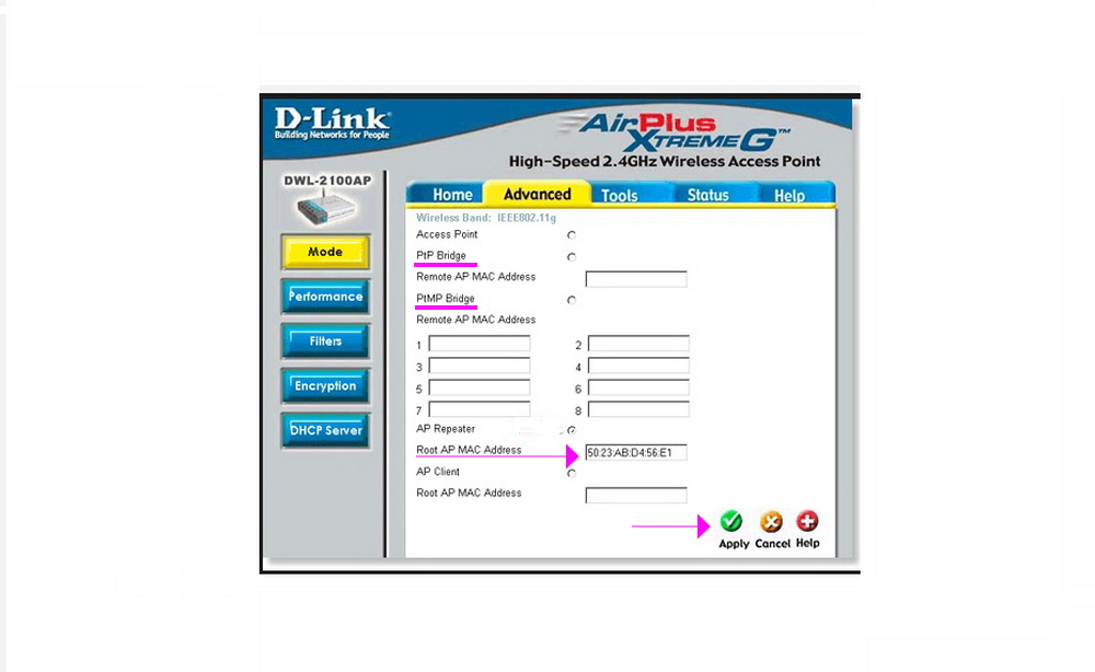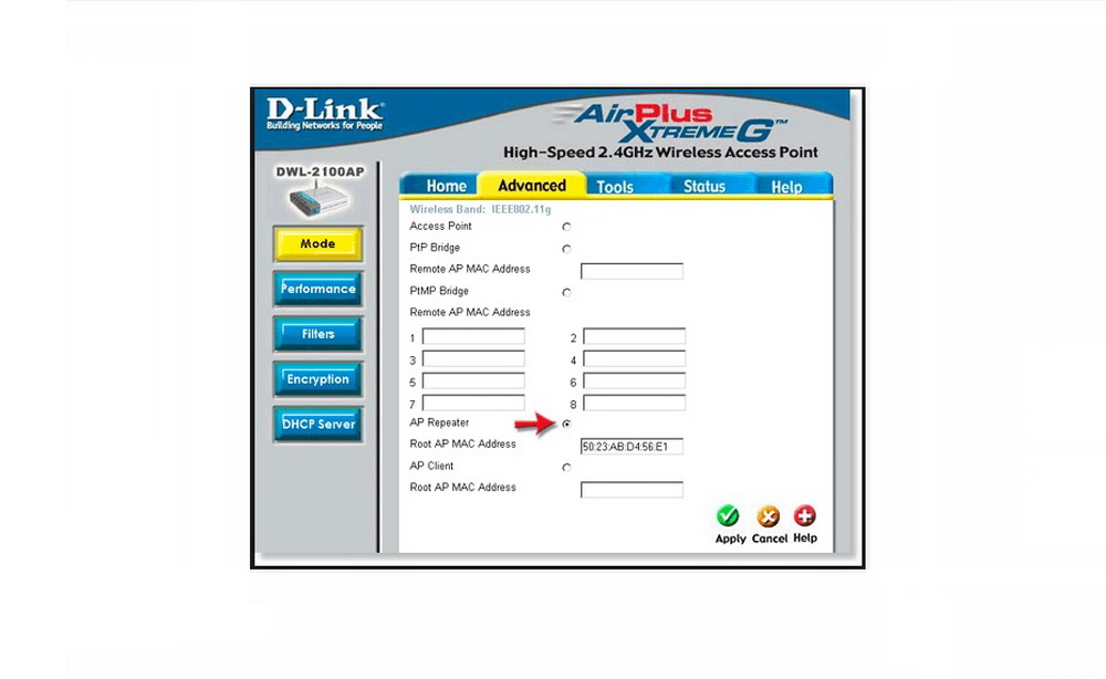 AP Repeater ретранслирует сигнал базовой станции. Активировать опцию можно точно так же, как и режим клиента: Advanced → Mode → отмечаем АР Repeater → прописываем MAC-адрес DWL-2100AP → Apply.