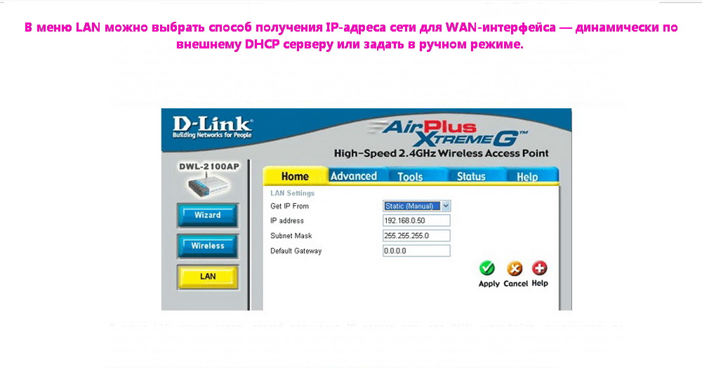 - В меню LAN выбираем способ получения ІР для DWL-2100АР — ручная прописка адреса либо динамическое получение. Нажимаем Apply.