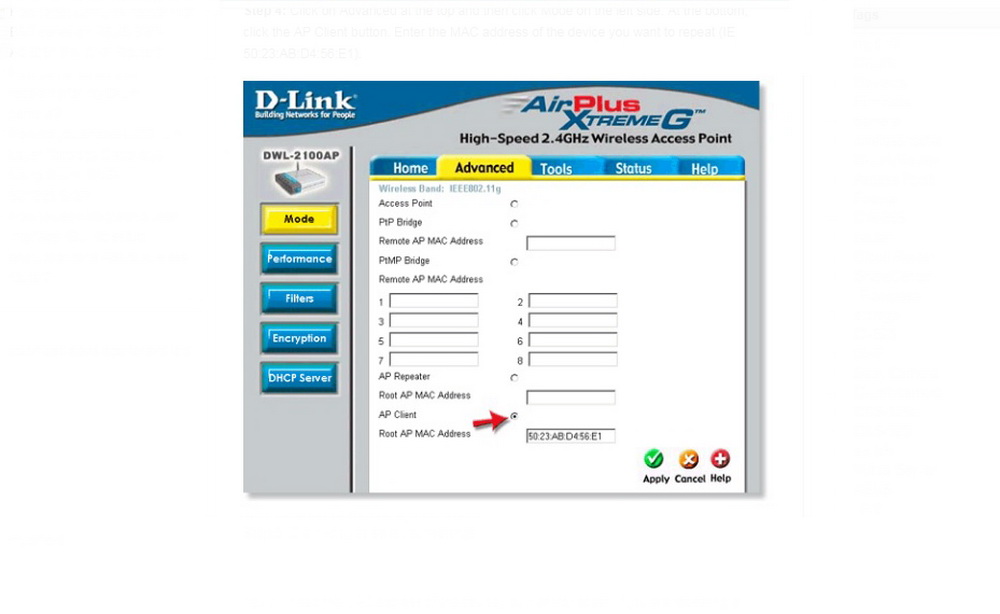 Настраивается беспроводной клиент аналогично созданию моста: Advanced → Mode → отмечаем флажком AP Client → прописываем MAC-адрес → нажимаем Apply для сохранения изменений.