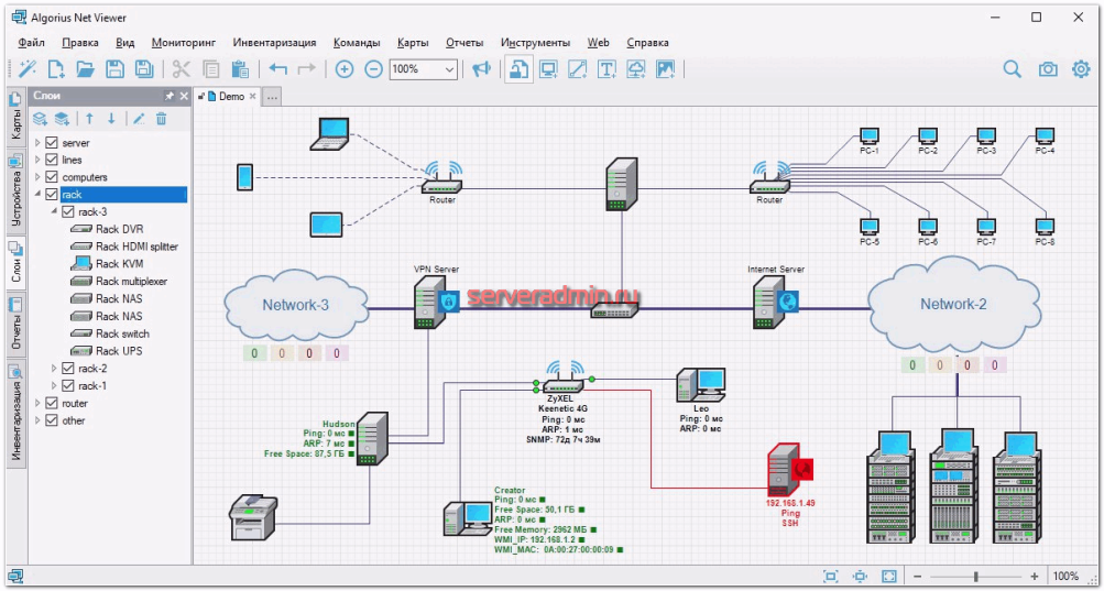 • автоматически обнаруживает всю сеть, используя следующие протоколы: CDP, FDP, LLDP, OSPF, BGP, SNMP и ARP.