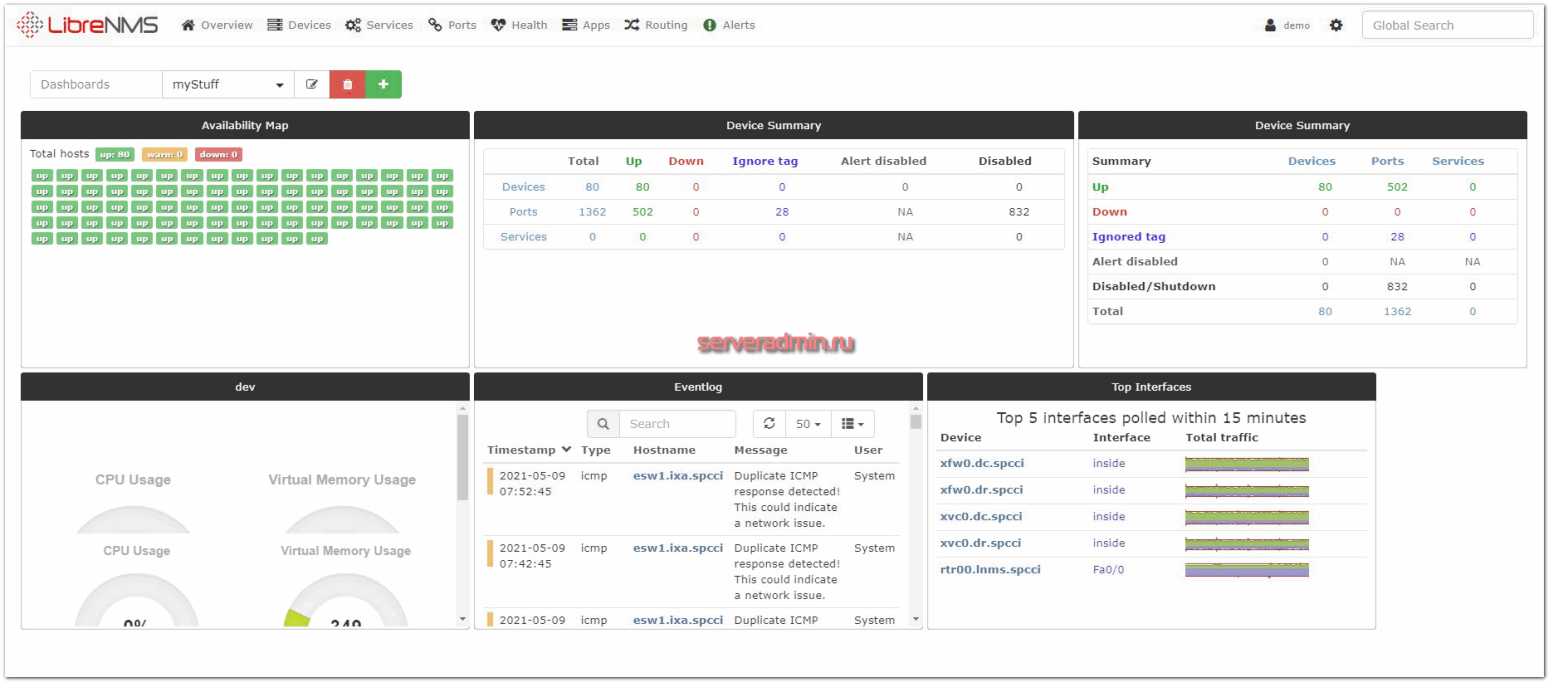 Демку можно посмотреть тут — https://demo.librenms.org. Учётная запись: demo / demouser.
