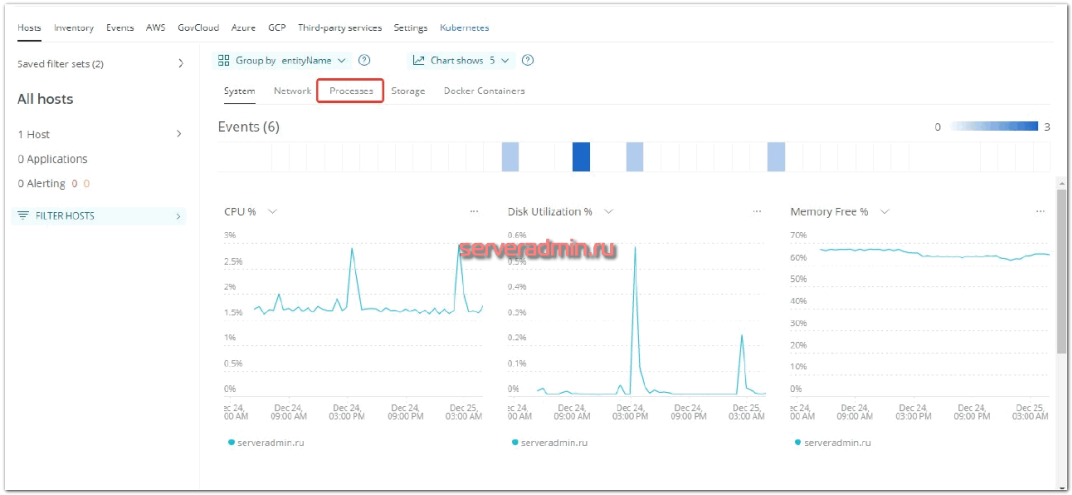 Функционал мониторинга очень крутой. Пользоваться удобно. Я мониторил только инфраструктуру с его помощью, то есть сами сервера. Но он умеет гораздо больше — логи, приложения, тесты через браузер и т.д. Даже при мониторинге сервера он автоматом наблюдает за каждым процессом, автоматом находит все docker контейнеры и следит за ними.