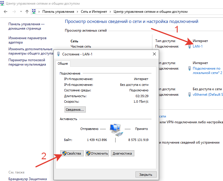 Панель управленияСеть и ИнтернетЦентр управления сетями и общим доступом