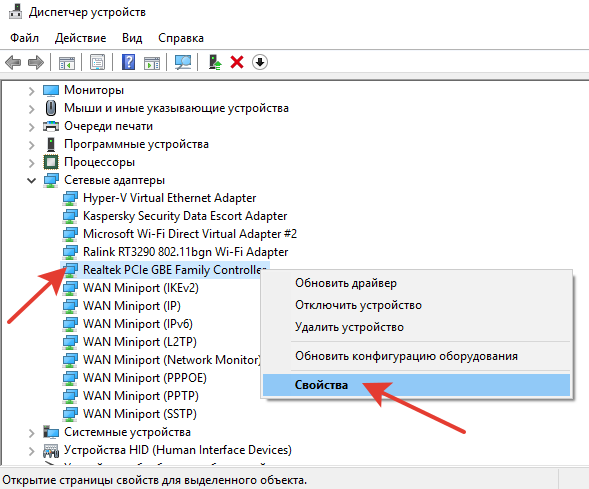 Или открываем «Диспетчер устройств» и находим там сетевой адаптер.  Затем открываем правой кнопкой мыши его свойства.
