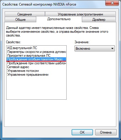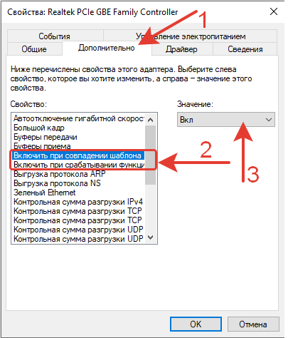 В зависимости от драйвера сетевого адаптера эти настройки могут называться по разному,  например «Пробуждение особым пакетом Magic» или «WOL Пакет Magic».