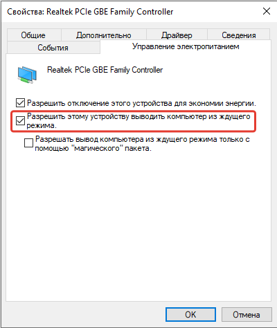 Переходим на вкладку «Управление электропитанием». Активируем галочкой пункт «Разрешить этому устройству выводить компьютер из ждущего режима». Можно так же активировать самый нижний пункт настроек, но необязательно. Нажимаем кнопку «ОК».