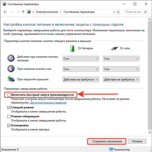 Панель управленияОборудование и звукЭлектропитаниеСистемные параметры. В разделе «Действия при нажатии кнопок» убираем галочку с настройки «Включить быстрый запуск (рекомендуется). Нажимаем кнопку «Сохранить изменения».