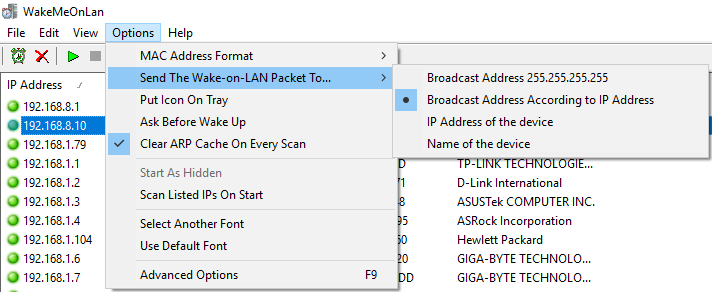 ПО сканирует сеть, сохраняет MAC, IP, имя ПК. Затем, когда компьютер выключен, его нужно выбрать из списка и нажать на кнопку с будильником в верхней левой части окна программы. В настройках можно выбрать, куда будет отправлен пакет (на широковещательный адрес, на IP компьютера или на его имя).