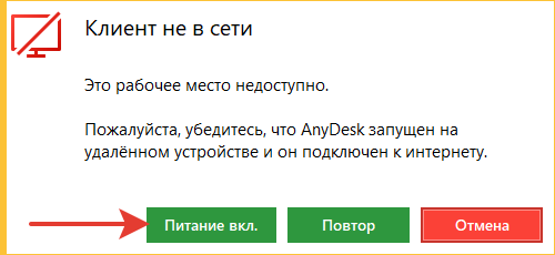 После того, как появится сообщение «Клиент не в сети», нажимаем кнопку «Питание вкл.».