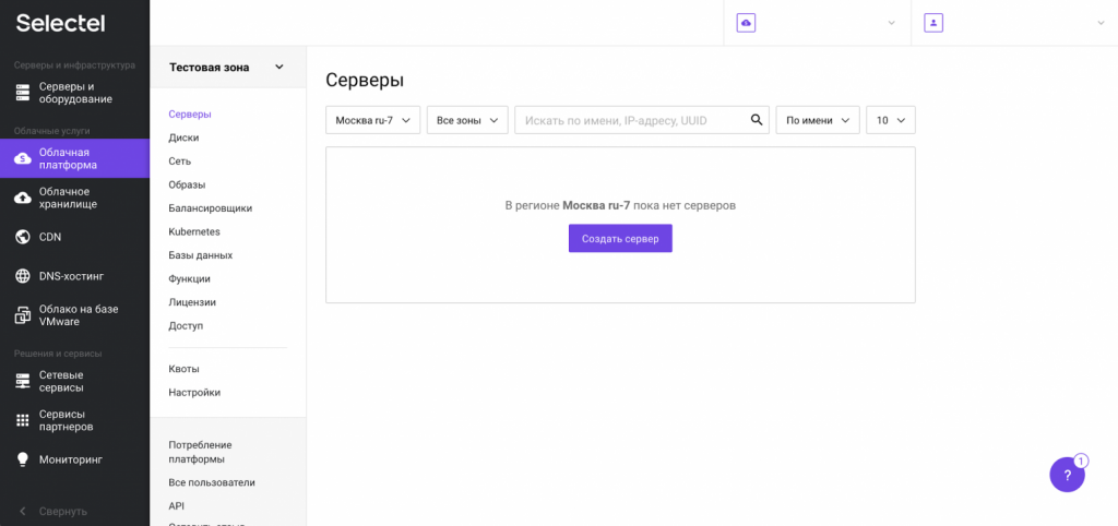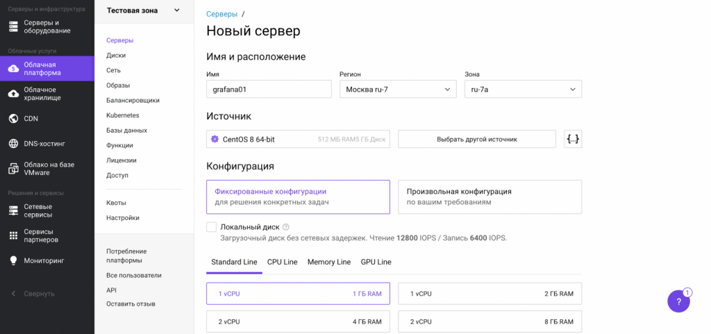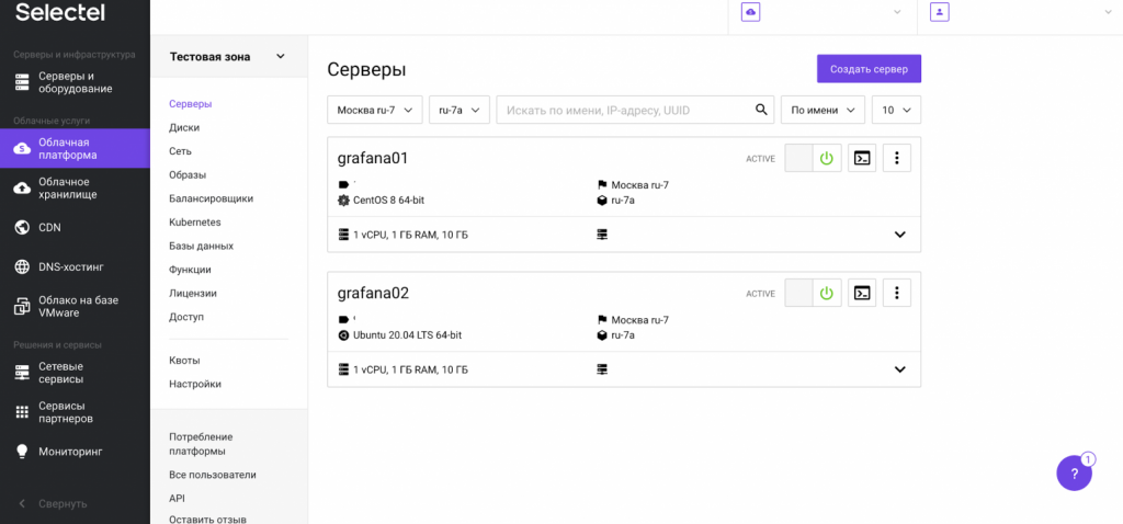 Перед началом установки Grafana, подготовим серверы. В консоли управления Selectel перейдём в раздел Облачная платформа и нажмём кнопку Создать сервер.