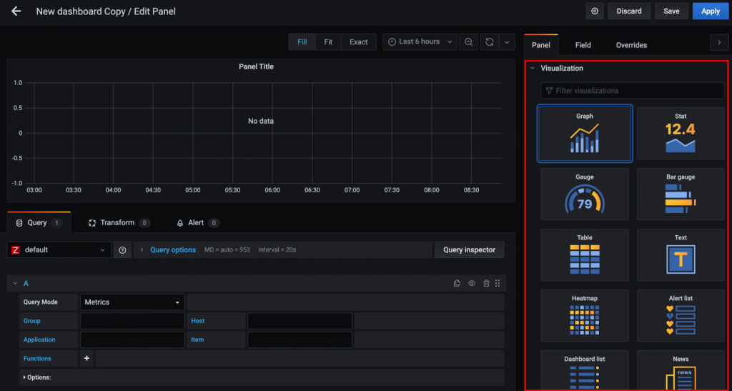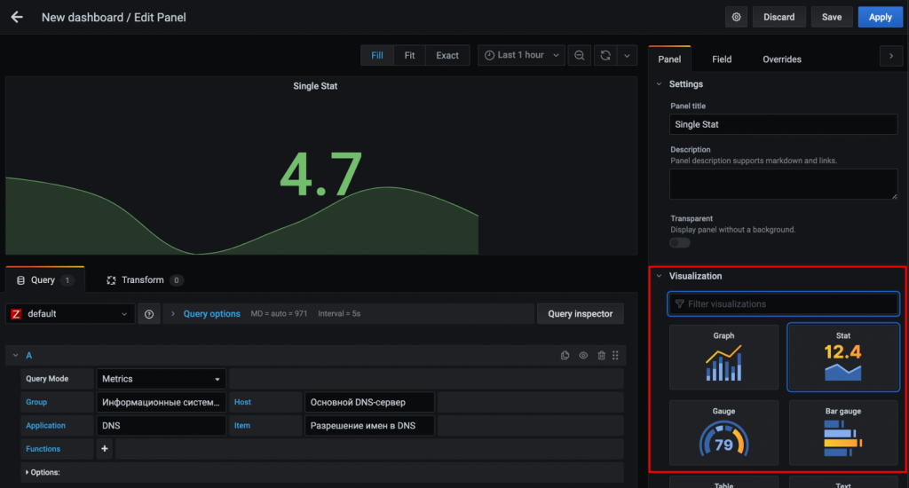 При создании новой панели, в правой части экрана в разделе Visualization есть возможность выбрать тип визуализации. Перейдем к созданию SingleStat (отображается как Stat) — панели с комбинацией численного и графического представлений. После ввода специфических данных для Zabbix, нажмём кнопку Apply.