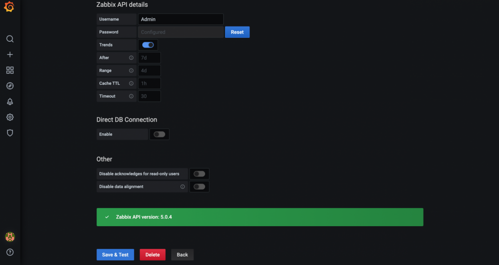 В настройках плагина укажем URL-адрес, имя пользователя и пароль для доступа по API к Zabbix.