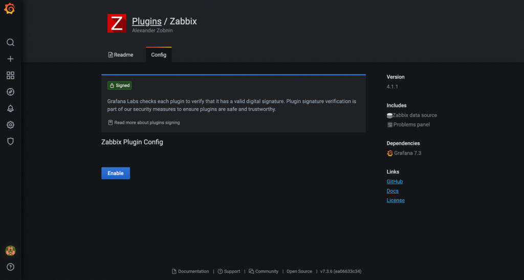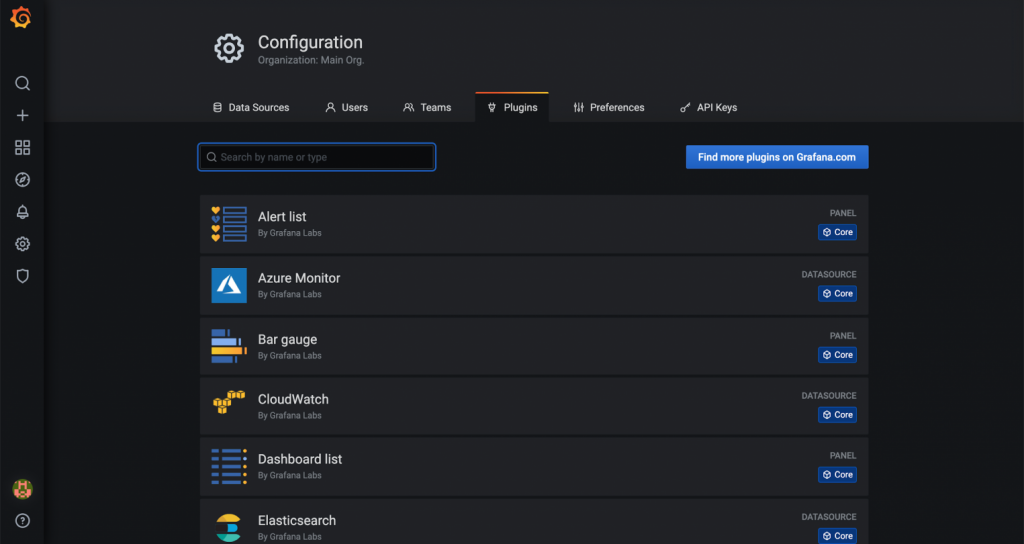 В интерфейсе Grafana перейдём в Configuration -> Plugins и обнаружим здесь плагин для Zabbix.