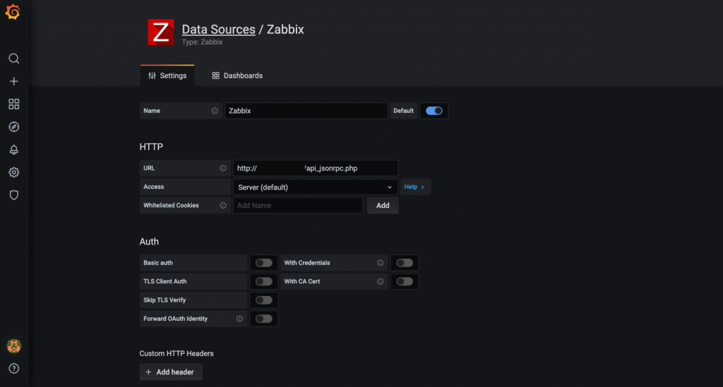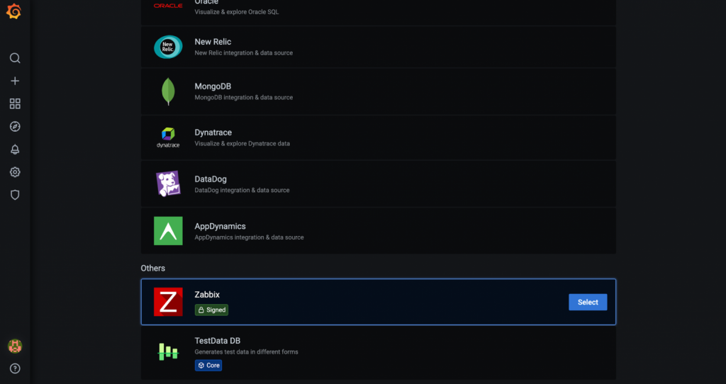 С момента включения плагина, в меню Data Sources появится новый источник данных — Zabbix. Нажмём на кнопку Select и настроим источник данных.