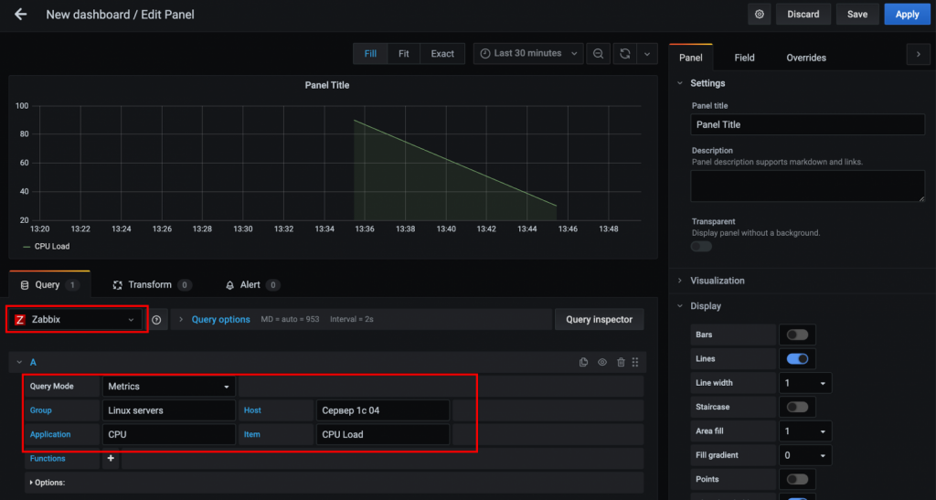 Далее выберем в выпадающем меню источник данных Zabbix и укажем группу, хост, приложение и элемент данных. Если всё выполнено правильно — на графике появятся данные.