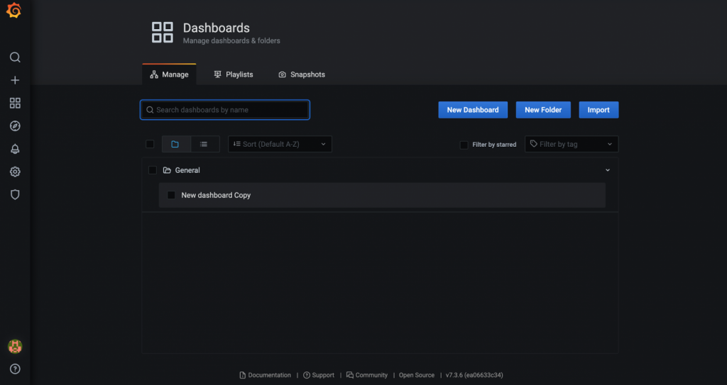 Панели и дашборды — основные сущности представлений внутри Grafana. Каждый дашборд состоит из набора панелей. Для создания дашбордов перейдём в представление Dashboards и нажмём на кнопку New Dashboard.