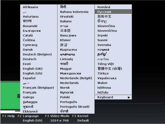 Через несколько секунд появиться главное меню. Нажмите F2 чтобы выбрать язык: