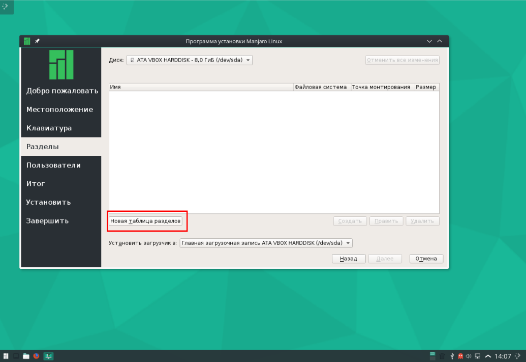 Если у вас чистый жесткий диск, нужно создать новую таблицу разделов. Нажмите соответствующую кнопку: