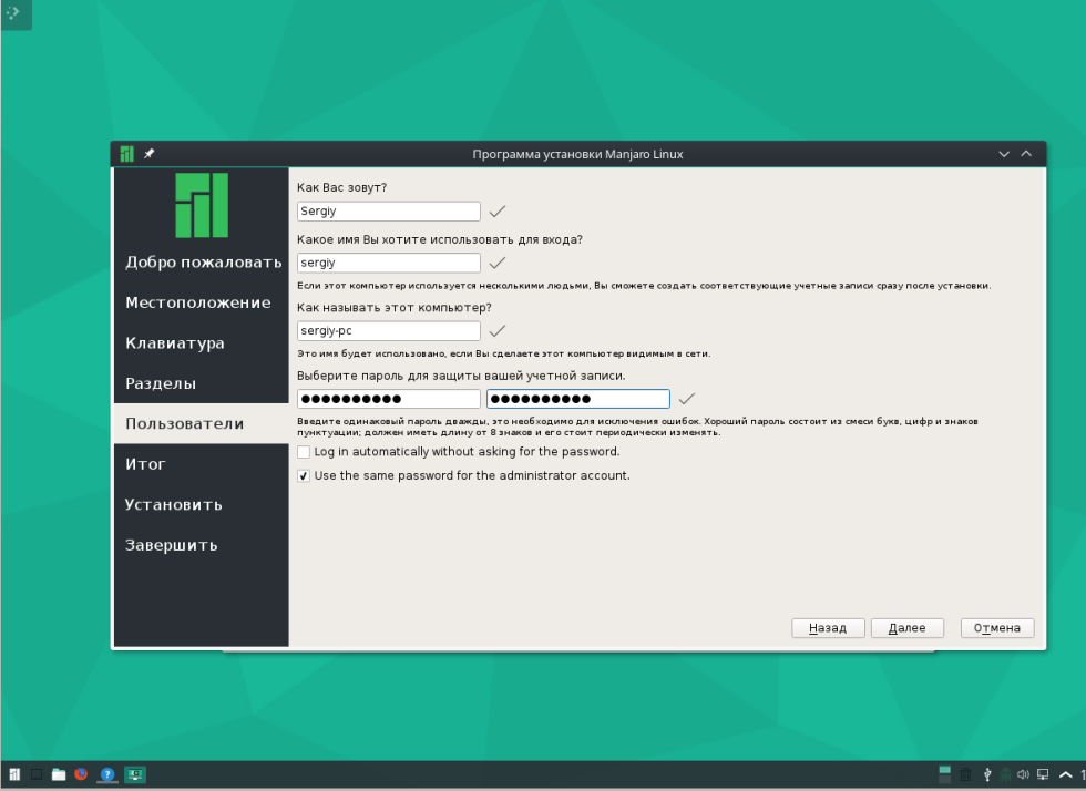 В этом же окне можно поставить галочки: использовать этот же пароль для суперпользователя и входить в систему автоматически.