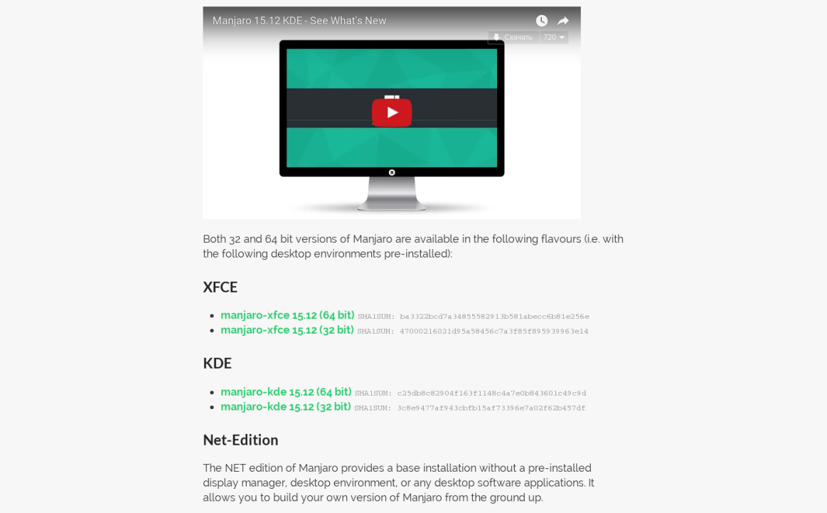 Установочные образы всех редакций Manjaro Linux доступны для загрузки на официальном сайте.