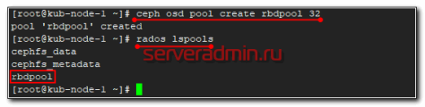 Теперь давайте создадим rbd диск в кластере ceph и подключим его к целевому серверу. Для этого идем в консоль на любую ноду кластера. Создаем pool для rbd дисков.