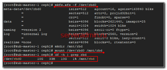 # mkfs.xfs -f /dev/rbd0 # mkdir /mnt/rbd # mount /dev/rbd0 /mnt/rbd # df -h | grep rbd