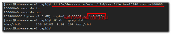 # dd if=/dev/zero of=/mnt/rbd/testfile bs=10240 count=100000 100000+0 records in 100000+0 records out 1024000000 bytes (1.0 GB) copied, 6.88704 s, 149 MB/s