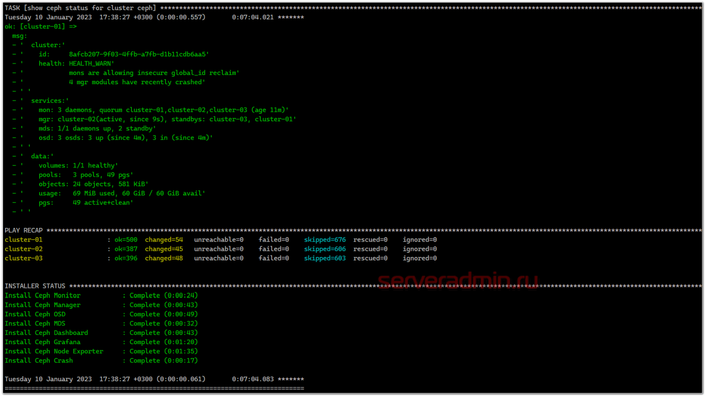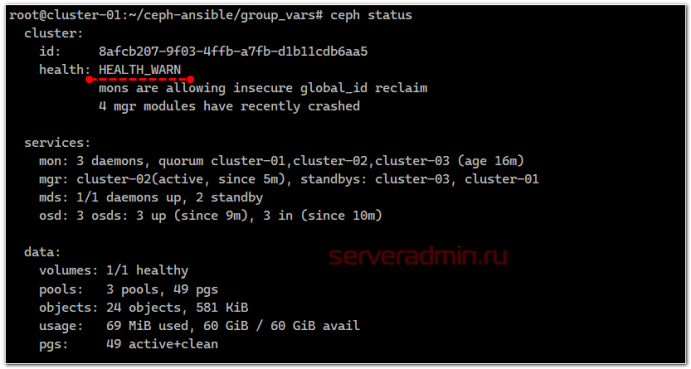 - Развернуть тестовый кластер ceph с помощью ansible-playbook.